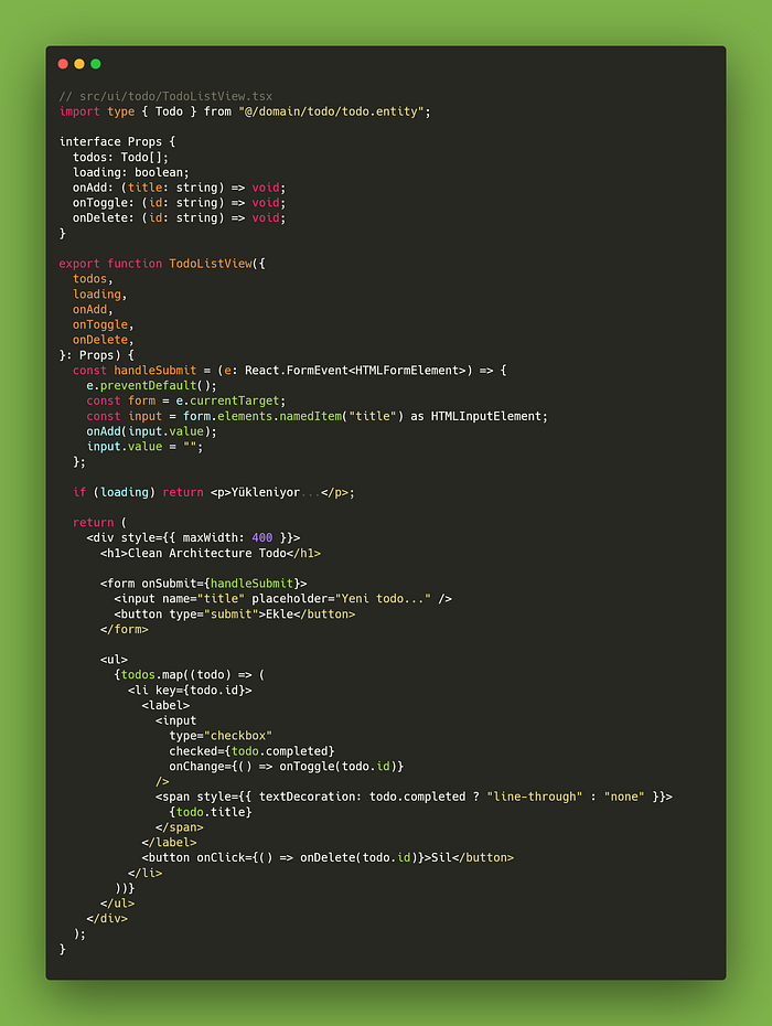 Clean Architecture’ı frontend’de uygulamak ilk bakışta fazla yapılandırılmış gelebilir; özellikle küçük projelerde “Buna gerek var mı?” sorusu akla düşer. Ancak mesele dosya dizinleri veya katman isimleri değil, zihinsel düzen kazanmaktır. Todo örneğinde gördüğümüz gibi, domain mantığını UI’dan ayırmak, veri erişimini bir detay olarak ele almak ve davranışları uygulama katmanında tutmak projeyi okunabilir, genişletilebilir ve test edilebilir kılıyor.