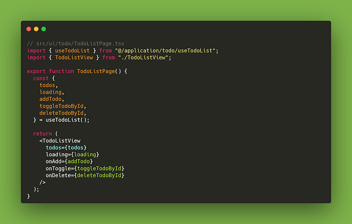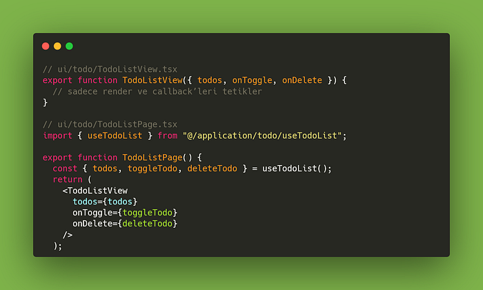 TodoListPageapplication katmanıyla konuşan container bileşeniTodoListViewsadece render yapan, “saf” UI bileşeni