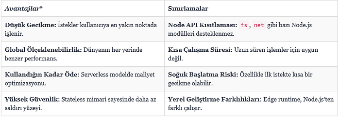 fs,net) desteklenmez. - Edge fonksiyonlar kısa süreli, stateless olmalıdır. Bu gerçekten önemli.