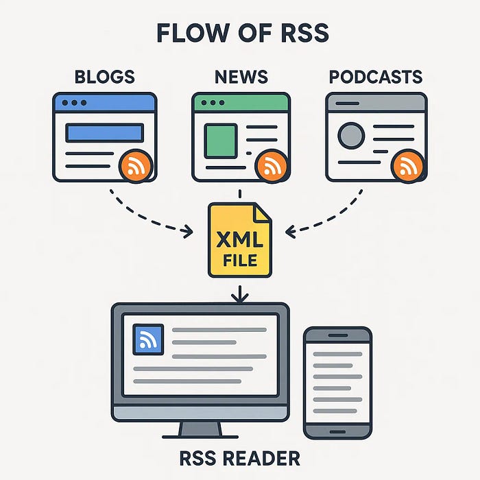 RSS (Really Simple Syndication), sitelerin yeni içeriklerini makinece okunabilir bir XML dosyası üzerinden yayınlamasıdır. Okuyucu (reader) uygulaması bu XML’i düzenli aralıklarla kontrol eder, yeni yazıları “okunmamış” olarak sana getirir. Konsept çok basit ve çok anlamlı.