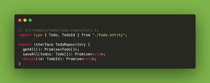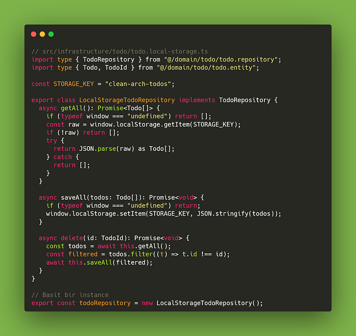 Burada domain’in tanıdığı tek şey TodoRepository interface’i. LocalStorage tamamen detay.