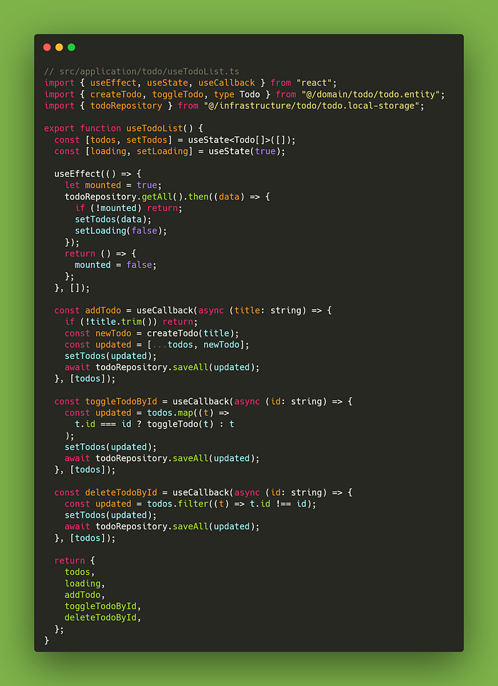 todoRepository) - Kendisi React’e bağımlı ama domain’e UI detayı taşımıyor.