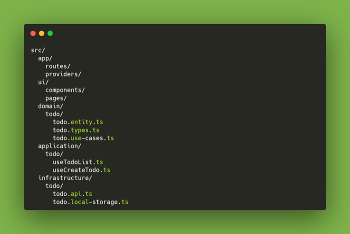 domain/todosadece todo’nun iş kuralları ile ilgilenir. “Todo nedir, hangi alanlara sahiptir, hangi durumlar geçerlidir?” gibi soruları yanıtlar.application/tododomain’i kullanarak UI’ya veri sağlayan hook’lar veya servisler içerir.infrastructure/todoAPI, localStorage veya başka bir kaynağa erişmek için gerekli adaptörleri bulundurur.uitarafı ise tamamen React component’lerinden oluşur.